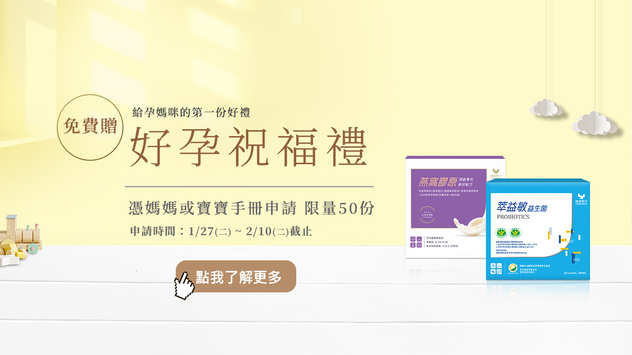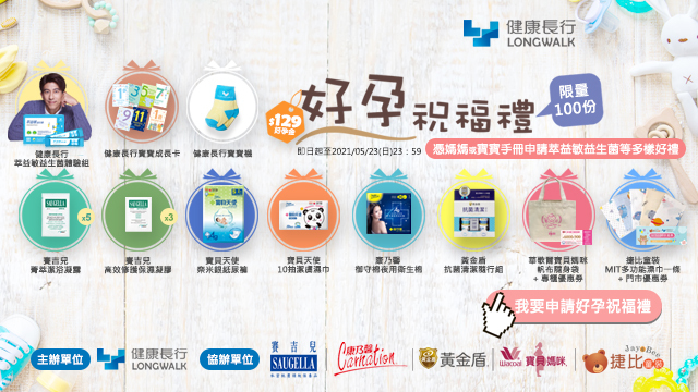 育兒路上媽咪們辛苦了,健康長行LONGWALK準備了50份市價$999的《好孕祝福禮》要寵愛媽咪們,內容除了健康長行的萃益敏益生菌外,也包括各大知名品牌提供的體驗組及育兒用品,憑媽媽手冊或寶寶手冊,加入健康長行官方FB社團,即可免費申請好孕祝福禮。