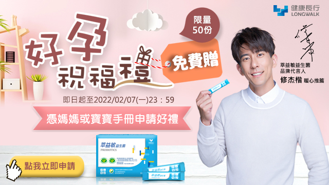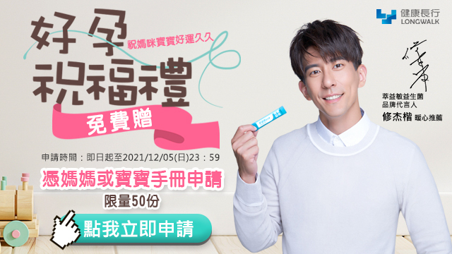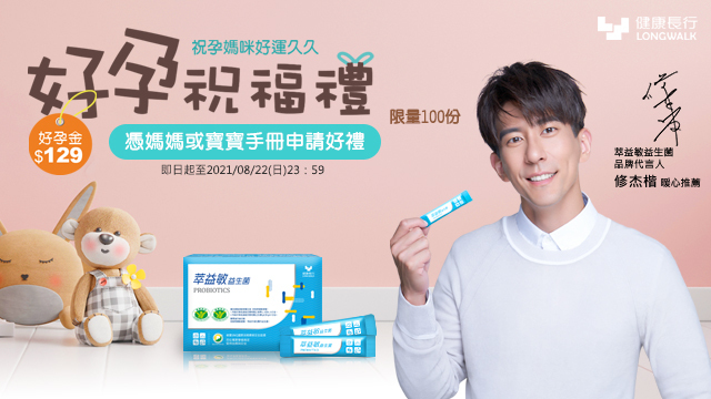 育兒路上媽咪們辛苦了,健康長行LONGWALK準備了50份市價$999的《好孕祝福禮》要寵愛媽咪們,內容除了健康長行的萃益敏益生菌外,也包括各大知名品牌提供的體驗組及育兒用品,憑媽媽手冊或寶寶手冊,加入健康長行LINE官方帳號,即可免費申請好孕祝福禮。
