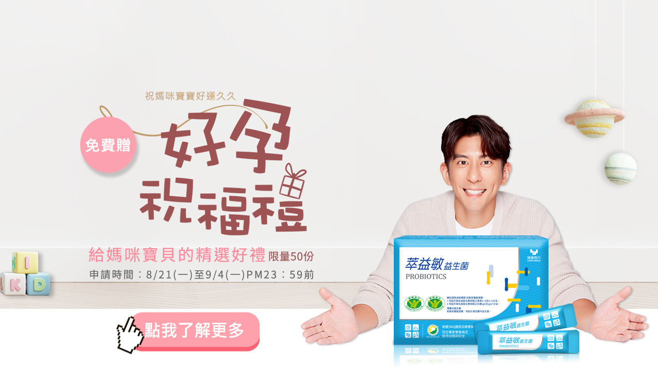 為了祝福媽咪寶貝好運久久,健康長行準備了50份市價$999的《好孕祝福禮》,內容除了健康長行的萃益敏益生菌外,也包括各大知名品牌提供的體驗組及育兒用品,歡迎孕媽咪們加入健康長行官方LINE申請。