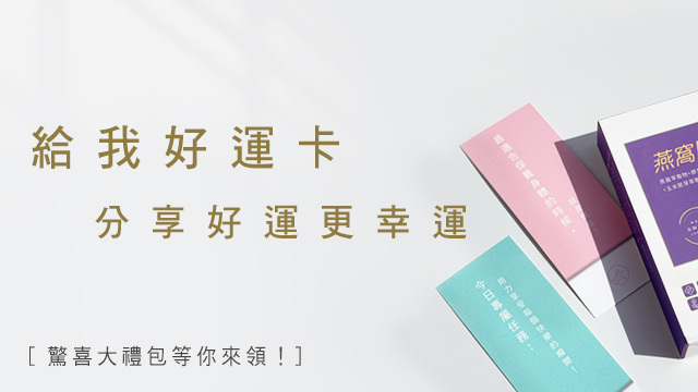 從今天開始,在社團以及個人社群分享收到的『給我好運卡』+產品,分享自己收到的好運與健康!除了能獲得的健康回饋金之外,還有機會抽中健康長行準備的精美好禮~收到的商品中沒有『給我好運卡』也沒關係,請踴躍的分享您訂購的商品,也有機會成為好運的天選之人。