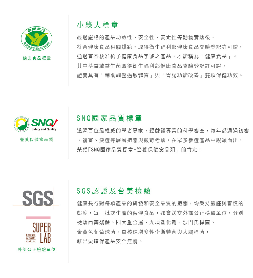產品研發始終以最嚴謹、最高規標準,取得衛福部小綠人與SNQ國家品質標章認證。