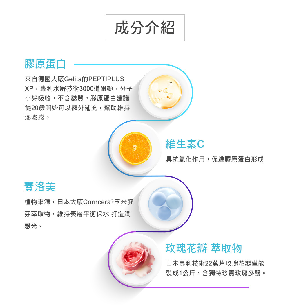 含有三項頂級專利美妍成分,包括日本頂級金絲燕窩精華、德國百年大廠水解膠原以及玫瑰花瓣萃取物。