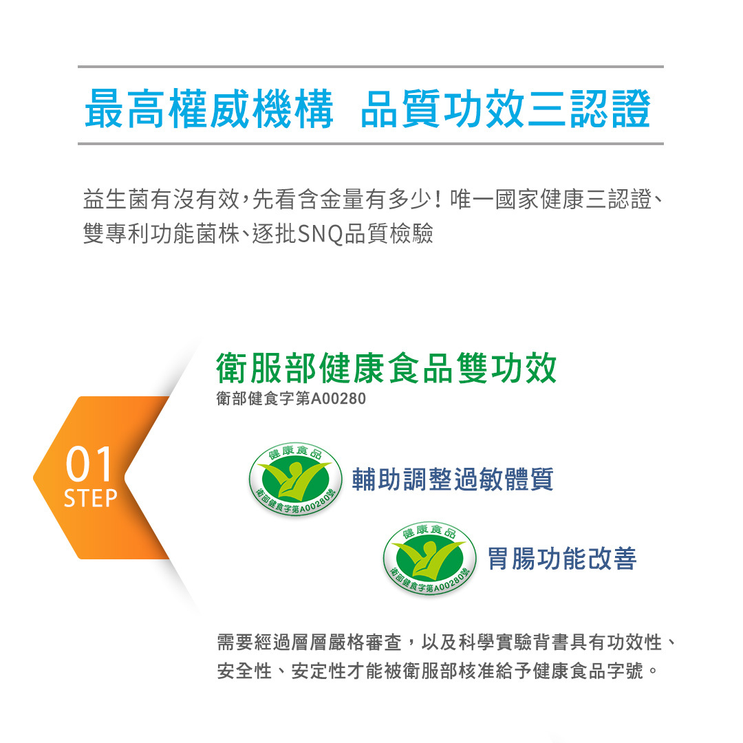 ☆有健康三認證-兩個健康食品標章+SNQ國家品質安全標章,健康食品標章表示通過實證,具有雙功效,不用擔心花大錢卻沒有效果。萃益敏益生菌兩個健康食品標章,包括輔助調整過敏體質及腸胃道功能改善,表示同時可以調整過敏體質和改善嗯嗯不順!!SNQ標章表示品質安全有保障,從原料到製程層層把關,是讓媽咪可以放心給孩子食用的兒童益生菌。