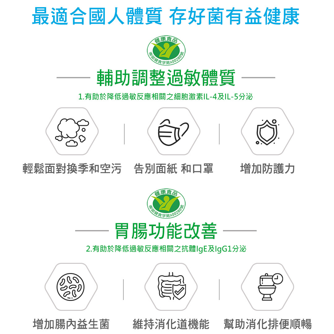 要通過健康食品小綠人標章是非常不容易的!! 因為要取得認證,要有基本的毒性測試,以確保安全外,也必須附有實驗證明功效,對消費者有最基本的保障。因此只要認明包裝上有健康食品小綠人標章,具有『輔助調整過敏體質』就可以確定是有功效的。