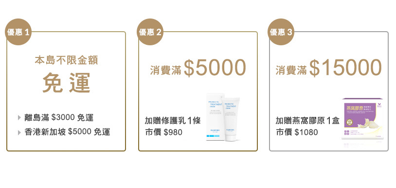 1.台灣本島全館滿1000元免運費,未達金額時另加150元的運費;外島地區滿3000元免運費,未達金額時則另加 200 元運費。※目前低溫商品僅提供國內配送