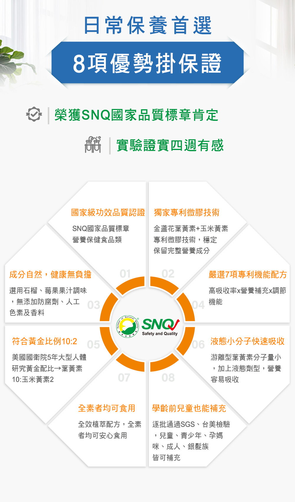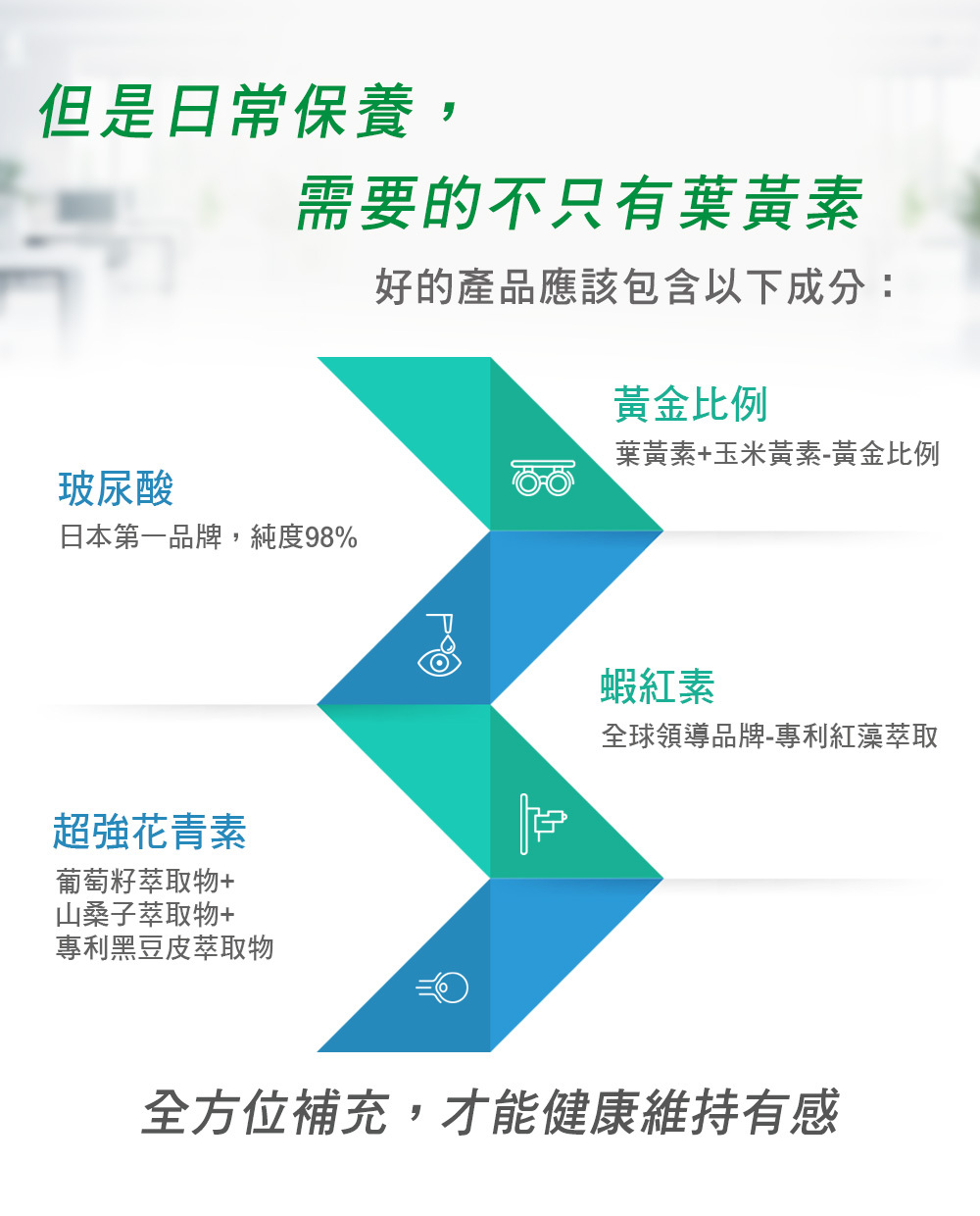 ▶搭配玉米黃素、玻尿酸、花青素、蝦紅素,完整守護